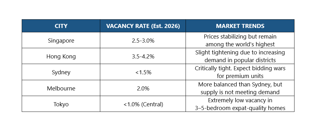 - Sydney and Melbourne remain key locations for the APAC operations of various industries. Despite several interest rate hikes in 2025, impacting businesses and individuals alike, investment in built-to-rent housing continues to boom. The supply, however, remains inadequate to the current demand and the rental market is punishingly tight. As in many global boom towns, corporate assignees compete with locals and students for a limited pool of premium rentals.